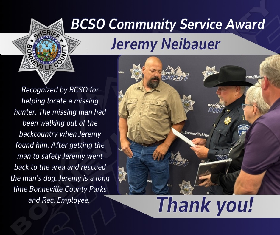 The Bonneville County Sheriff’s Office is proud to recognize Jeremy’s efforts with this award, and we thank him for his continued hard work!