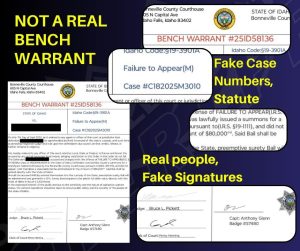 The “Bench Warrant” contains some of the victims information along with logos and identifying information from Bonneville County and BCSO. The document also lists names of Seventh Judicial District Judges and Bonneville County Deputies, with obviously fake signatures. Additionally, the document is made to appear real with case numbers, codes to state statute, and the address to the Bonneville County Courthouse. An additional document sent to victims appears to be a “Non-Disclosure Agreement with generic looking government watermarks.