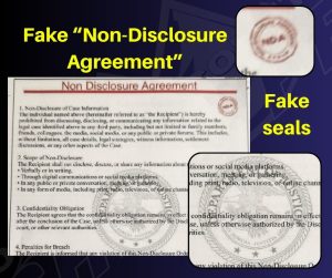 The “Bench Warrant” contains some of the victims information along with logos and identifying information from Bonneville County and BCSO. The document also lists names of Seventh Judicial District Judges and Bonneville County Deputies, with obviously fake signatures. Additionally, the document is made to appear real with case numbers, codes to state statute, and the address to the Bonneville County Courthouse. An additional document sent to victims appears to be a “Non-Disclosure Agreement with generic looking government watermarks.
