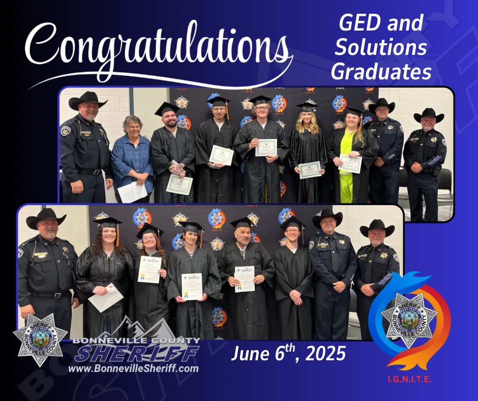 The I.G.N.I.T.E. Program at the Bonneville County Jail reached a milestone last night, graduating 5 inmates from The Solutions substance abuse program and 5 current and former inmates who earned their GED. These latest graduates bring the total number of people receiving their GED during incarceration to 50, a milestone reached in less than 18 months since the implementation of the I.G.N.I.T.E. program and becoming a certified GED testing center. Alongside the successes of the GED program, more than three dozen inmates have graduated The Solutions Program, a 12 week substance abuse and rehabilitation course with continuing resources and education to help graduates build a better future.