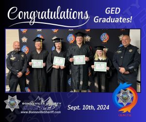 The Bonneville County Sheriff’s Office is proud to recognize Kristepher Chappell, Ryan McCready, Seth Tanaka, and Breanna Anderson for their hard work in completing their GED on September 10th, 2024. Additionally, we are proud to recognize Matthew Phillips, Samuel Gale, Tara White, Katherine Wilding, Brayden Fullmer, Cameron Perkins, and Alexander Sparks for graduating from The Solution Program. All of these individuals put in the time and hard work to achieve this success, which is absolutely something to be proud of. We are excited to see what the future holds for them and wish them the best of luck.