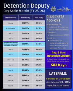- Depending on staffing needs, we typically fill most patrol positions from Detention Deputies already on our team and Certified/Certifiable Lateral applicants.