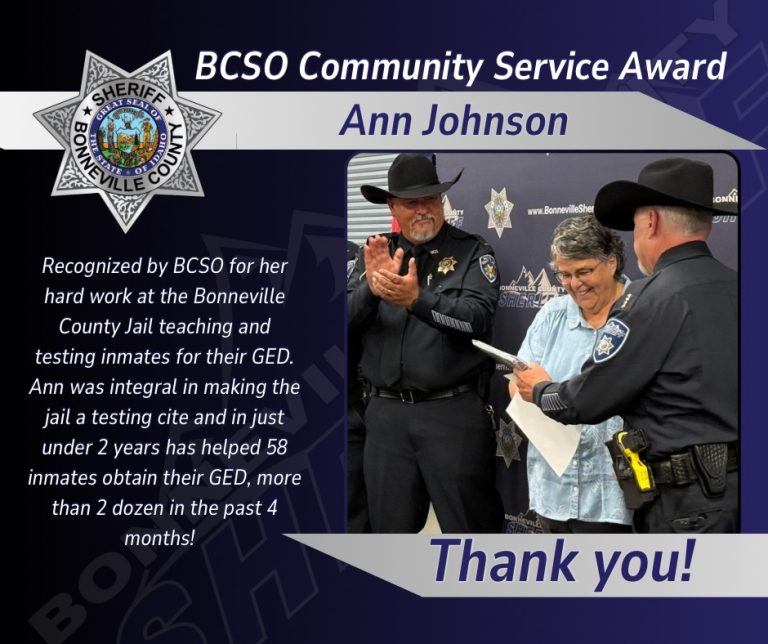 Bonneville County Sheriff Sam Hulse and the BCSO Team recognized Ann Johnson this week with the Sheriff’s Office Community Service Award. Ann has been an integral part of helping inmates at the Bonneville County Jail obtain their GED by helping the Sheriff’s Office become a testing site, the only one inside a jail facility in the state of Idaho. In just under 2 years, since the launch of the IGNITE Program, Ann has helped 58 people graduate with their GED, two dozen of those in the past 4 months!